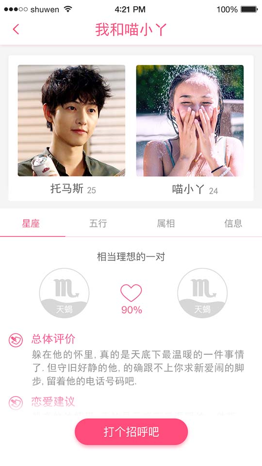 天生一对 是一款基于推荐算法的全新模式社交应用。软件根据用户的星座、属相、五行、位置、标签等信息,计算并推送身边与你匹配的人,有效帮助用户结识互有好感的人。.